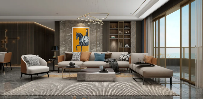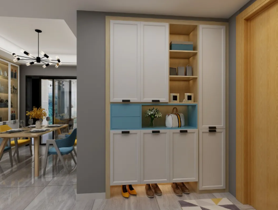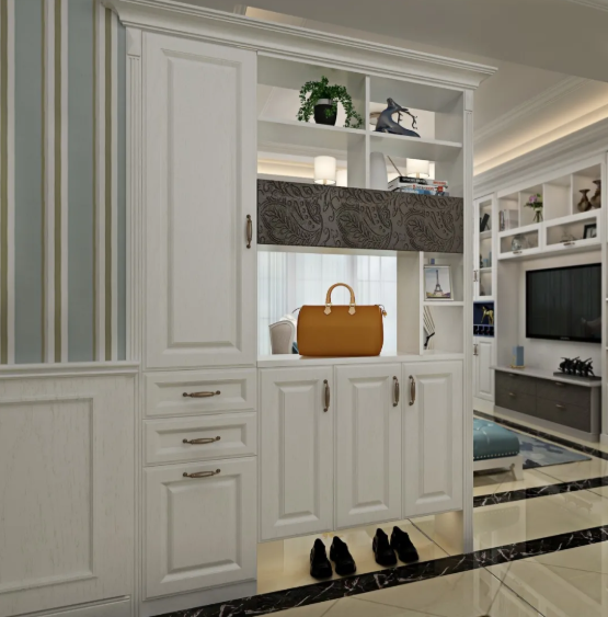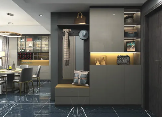當業主回家后第一要務就是消毒,所以在設計時,在考慮入戶動線的情況下要在玄關處隔離一切可能的污染源。可選擇在進口處設置一個置物臺,像一些小掛件、配飾等物品可放置此處,避免將他們帶入居室形成二次傳播污染。