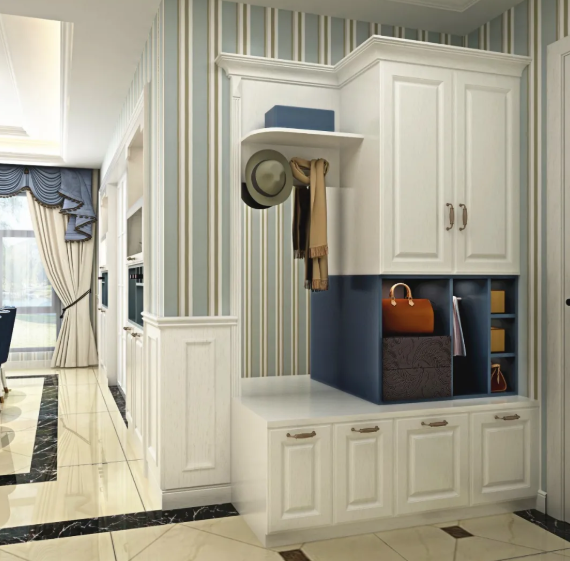 病毒細菌喜歡依附在鞋子、帽子和外套上,所以在設計時可以考慮一個置頂的衣柜,通過格柵把鞋子和外套分隔開,不僅方便還實用。有必要的話還可以在柜子的一側放置衣簍,切記,外套衣服在放置時一定要反著掛。