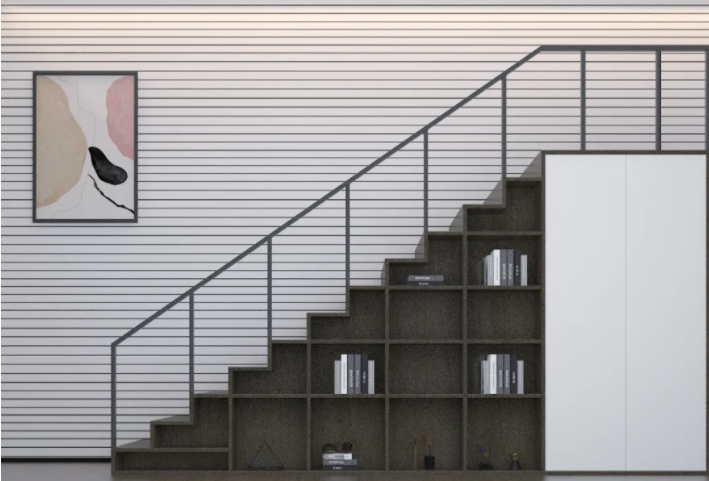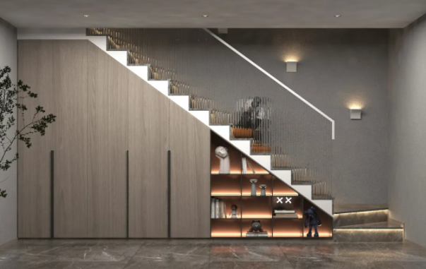 樓梯下方多余的空間,有一個很重要的作用便是收納。若你擁有這樣的一個樓梯,超級nice。我們可以根據(jù)樓梯的層層遞進,將下方空間和定制收納柜相結合,既能有效利用空間,又可以擺放大量的雜物,是一個非常不錯的選擇哦。