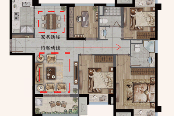 傳統的單通道串聯起各個空間的做法,做家務時來回折返,非常影響效率。
