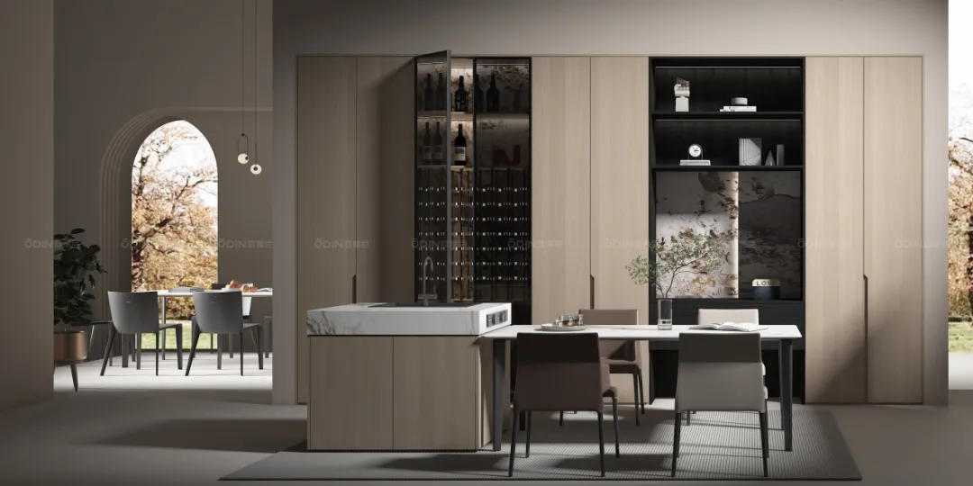 定制餐邊柜通過空間優化、功能復合、美學設計、個性化定制四大核心優勢,將餐廳從單一用餐區升級為集收納、操作、展示于一體的多功能空間。