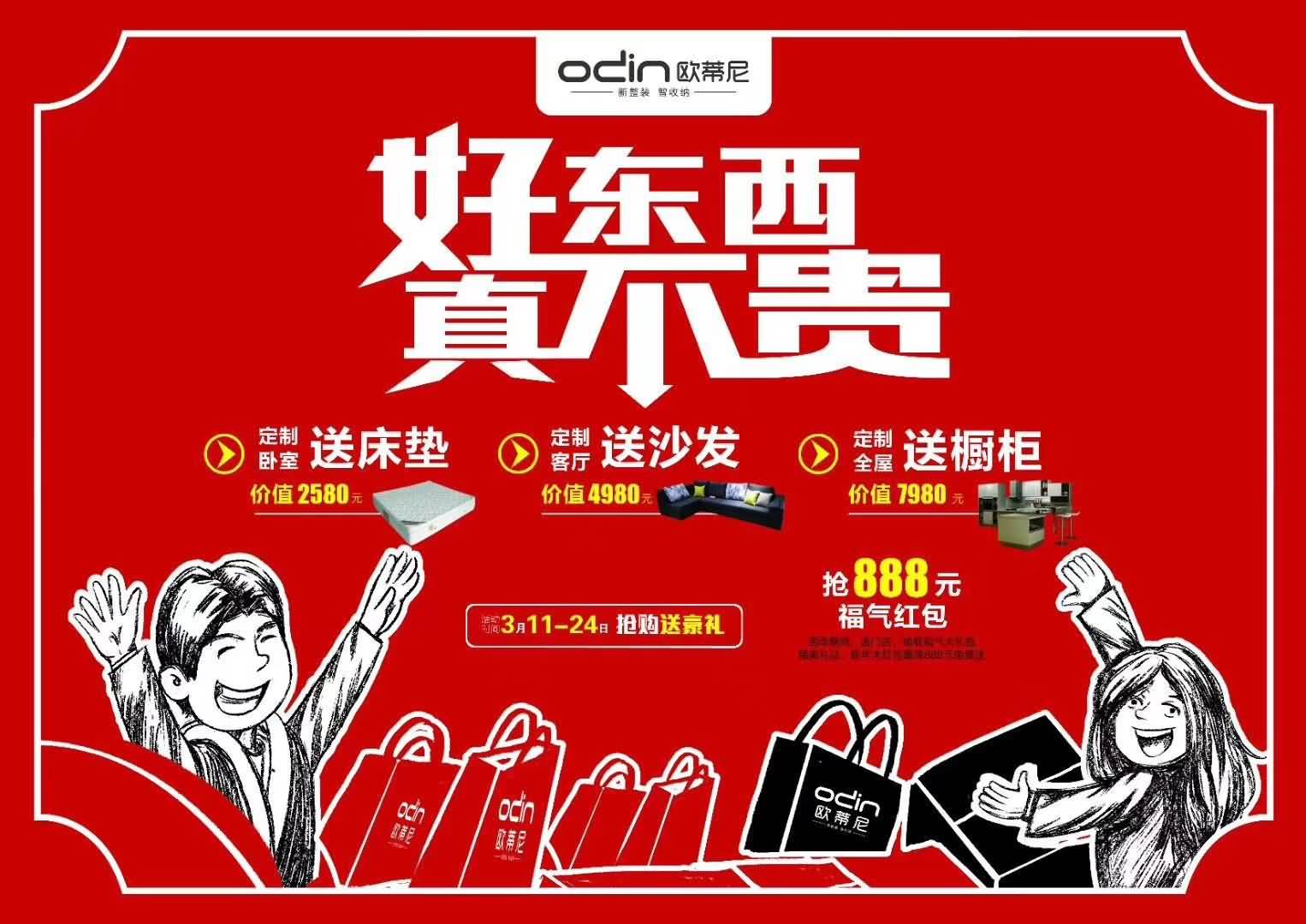 此次3.15活動,歐蒂尼推出“定全屋送櫥柜、定臥室送床墊、定客廳送沙發”等優惠政策,還有888元福氣紅包和精美進店禮品,超值產品吸引了大批業主咨詢、下單。
