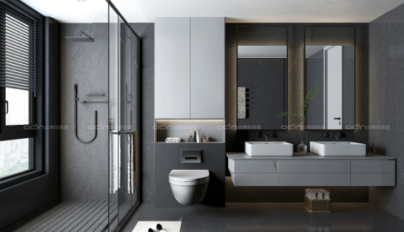 點滴細節,“浴”見品質生活。衛浴間巖板臺面,因“薄”出彩。巖板的自然紋理與背景墻瓷磚相得映彰,盡顯原始之美。巖板具有硬度極高、韌度高、防火防潮、無污染易清潔等優點,其臺上盆設計,盡顯素雅格調慢生活。