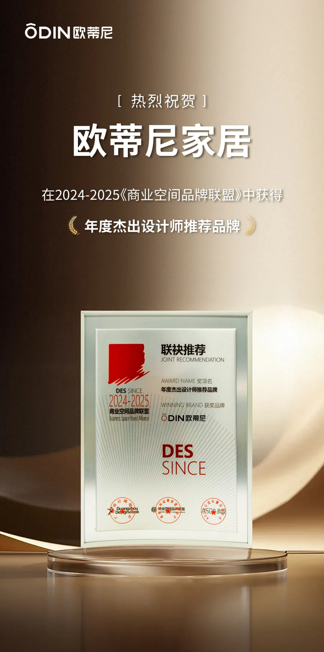 實力見證,榮耀綻放!近期,歐蒂尼家居作為華東地區(qū)領先品牌,榮耀受邀參加了備受矚目的廣州設計周活動。在此次盛會中,歐蒂尼家居憑借其超凡的品質與無限的創(chuàng)意潛能,在DES SINCE 2024 - 2025《商業(yè)空間品牌聯(lián)盟》評選中,榮耀加冕為“年度杰出設計師推薦品牌”大獎的得主!這一輝煌成就,如同璀璨星辰,閃耀著無數(shù)頂尖設計師對歐蒂尼家居的高度認可與由衷贊譽。