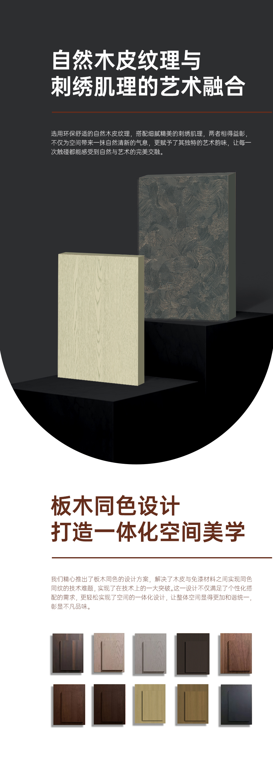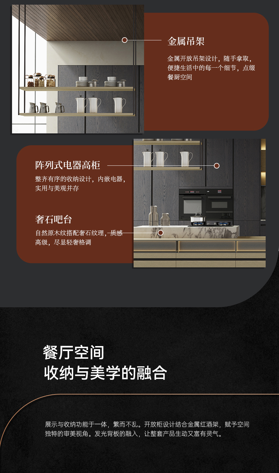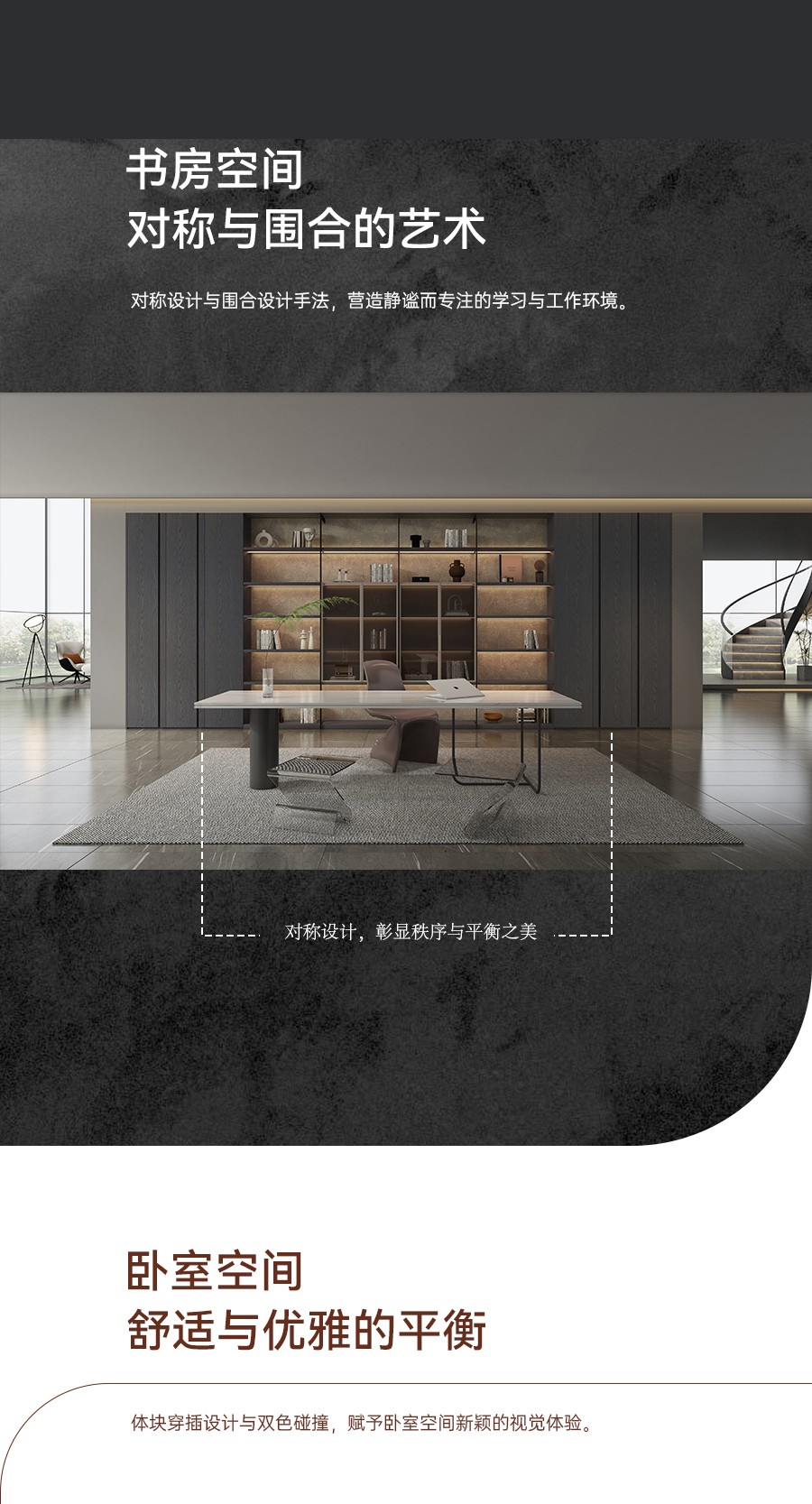 在空間應(yīng)用上,“寫意” 系列更是表現(xiàn)卓越。櫥柜空間中,餐島一體式西廚設(shè)計(jì),開放式布局增加了家庭互動(dòng)性;餐廳的收納空間,將美學(xué)與實(shí)用完美結(jié)合;客廳以輕盈與質(zhì)感的碰撞,展現(xiàn)獨(dú)特魅力;入戶空間藝術(shù)與功能交織;書房運(yùn)用對稱與圍合手法營造靜謐氛圍;臥室則實(shí)現(xiàn)了舒適與優(yōu)雅的平衡。每一個(gè)空間,都承載著對美好生活的向往。