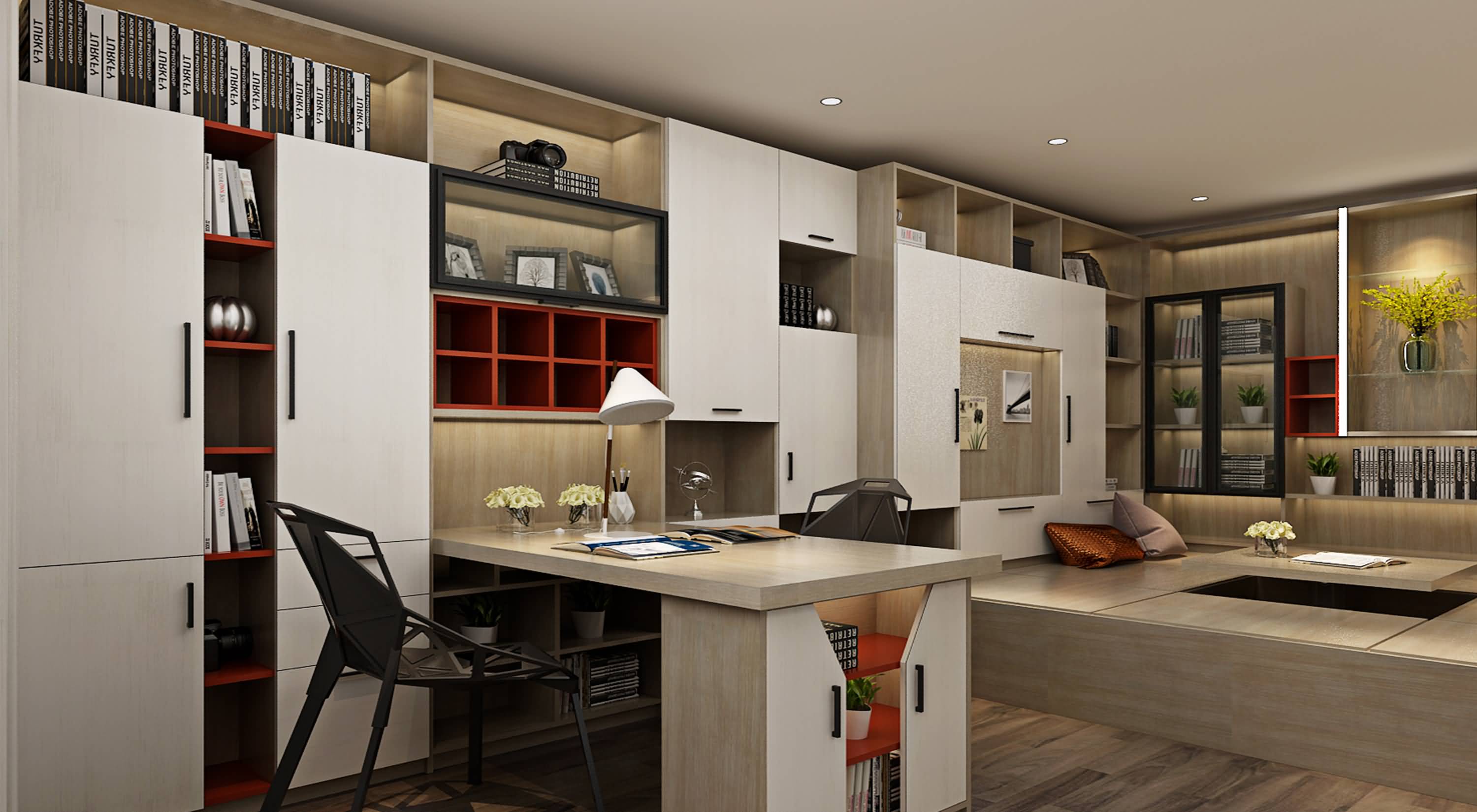 書桌側(cè)面斜角平開門跟榻榻米融 入立柱燈帶,酒柜折疊餐桌的隱 藏功能,絲絲縷縷的跟狂野開 放的主題相結(jié)合,豪放不羈! |
